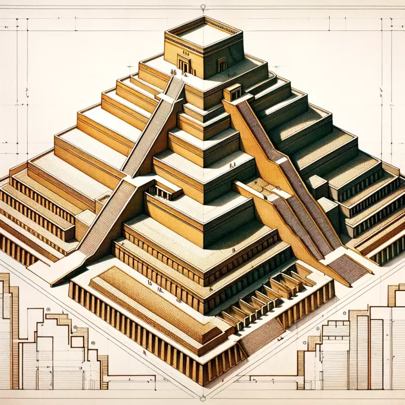 1. **Structure en terrasses :** Les ziggurats se composent de plusieurs niveaux ou terrasses, avec un noyau solide fait de briques d'argile et une façade extérieure de briques cuites. La construction en terrasses donnait à la ziggurat une apparence de pyramide à étages.